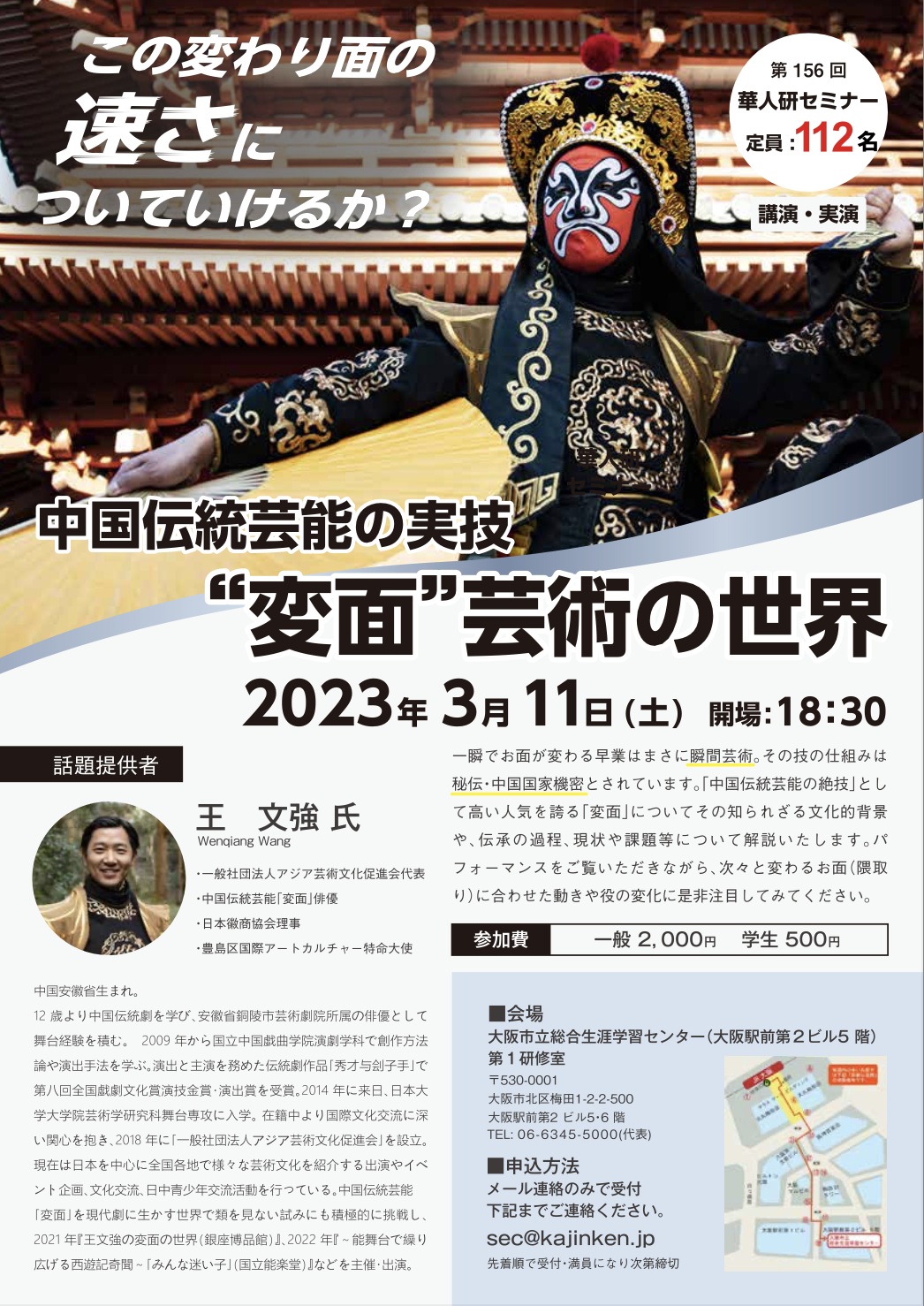 【変面セミナー&実演】関西圏で初開催! 3月11日(土)大阪に参ります!! とある方のご厚意・ご紹介で、大阪で活動されている「華人研」様の例会で、来月変面...