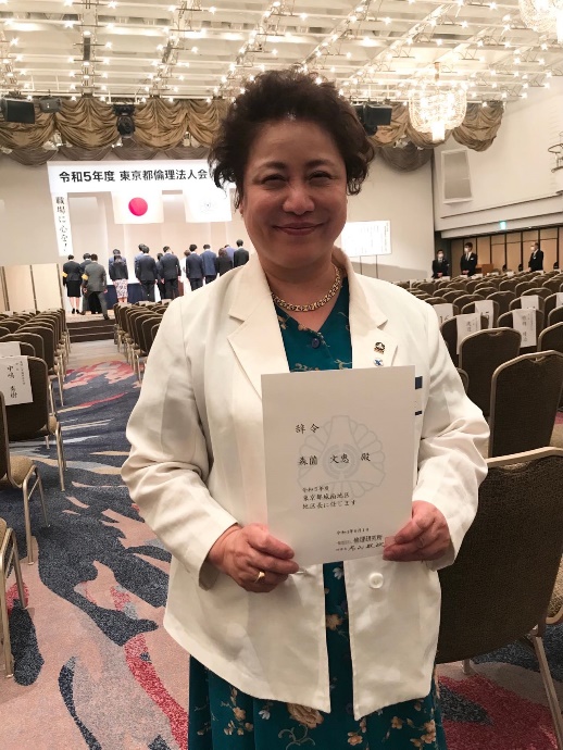 2022年9月6日、東京都倫理法人会城南地区長の辞令を受けた森薗文恵さん