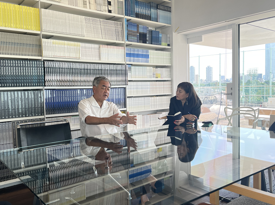 南青山の隈研吾建築都市設計事務所(KKAA)に出向き、隈研吾氏(以下、隈氏と略称)を取材した。取材には、庭園デザイナーの石原和幸氏にも同行していただいた。前々回のコラムで取材した石原和幸氏はチェルシーのフラワーショーで11年連続してゴールド賞を受賞している庭園デザイナーで、来年のチェルシーでは隈氏と茶室をコラボする計画が進められている。取材をした部屋は隈氏の出版された本が壁一面に飾られており、中には韓国語や中国語など多言語バージョンに訳された著書も目立った。