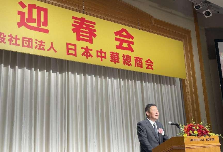 日本中華總商会の厳浩理事長の音頭で、参加者は新年を祝い、明るい未来を祈って乾杯した。