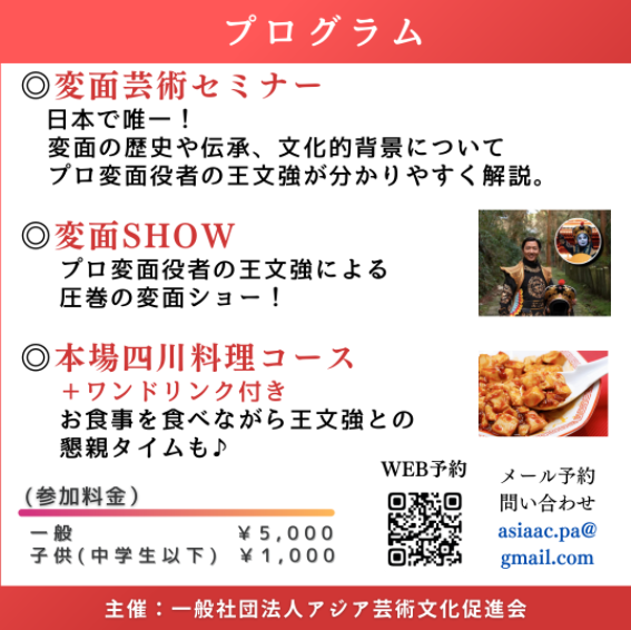 参加費:一般5,000円(四川料理コース+ワンドリンク付き、税込)