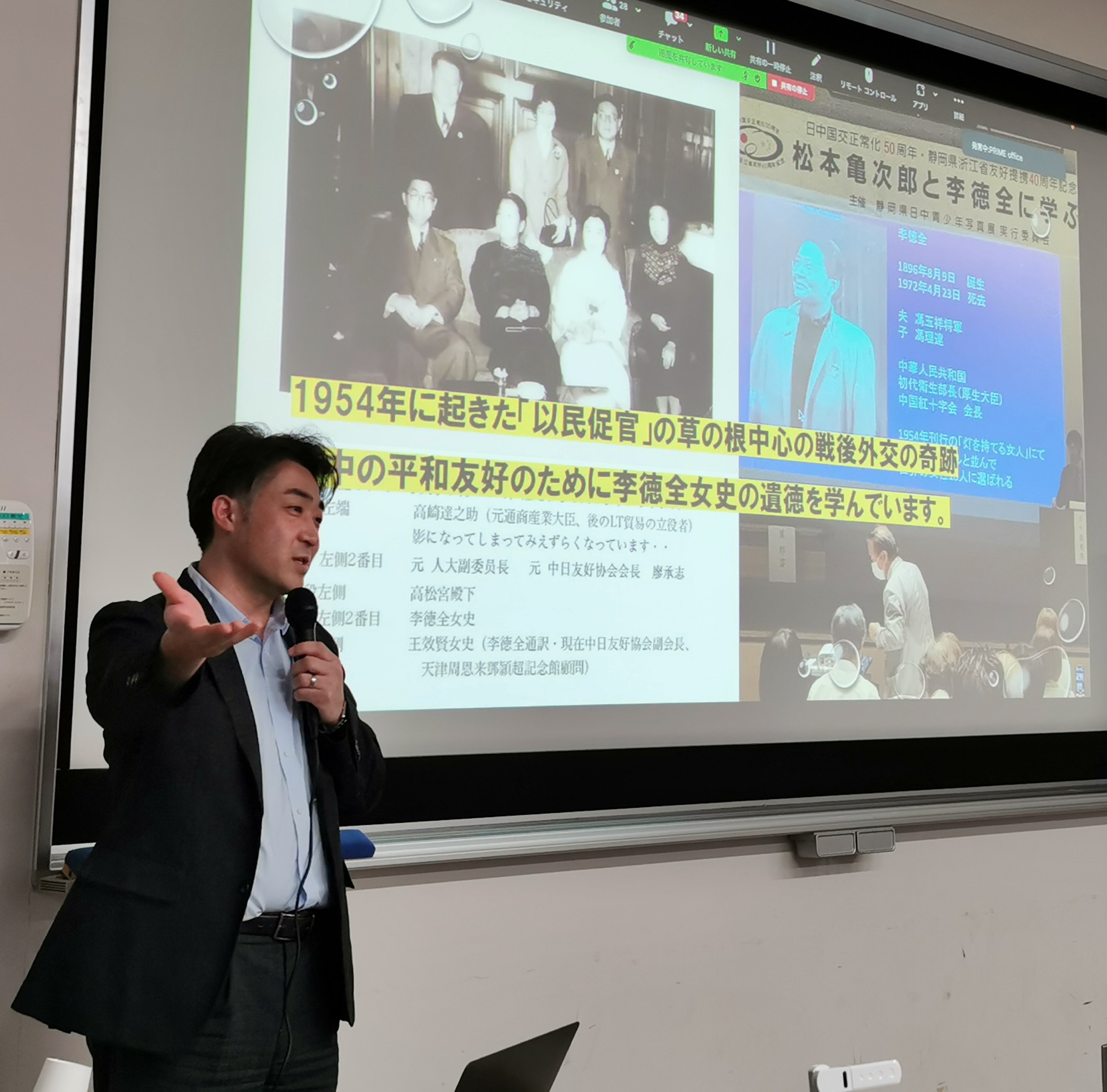 とはいえ、五十嵐氏らの取り組みは、こうした国際関係の壁の前に立ち止まってはいない。国家間関係に困難があるなら、民間で先取り的に可能性を模索し、それに政府を巻き込んでいこうと取り組んでいる。このアプローチは、日中間に国交がない時代に突破口となった「以民促官(民間が政府の動きを促す)」という歴史的経験から学んだ。同氏らはその可能性を深めるため、まず「一般社団法人 李徳全研究会」を立ち上げた。李徳全女史は、中国紅十字会総会(赤十字に相当)の会長として、1954年に日本の民間平和団体に招かれて来日し、日本人戦犯や残留日本婦人らの帰国実現に道筋を付ける上で大きく貢献した。現在の日本政府も当時と同じように中国敵視を鮮明にしているが、同じアプローチが有効だと考えたのは、中国の平和主義は一貫しているという洞察からである。(写真1)