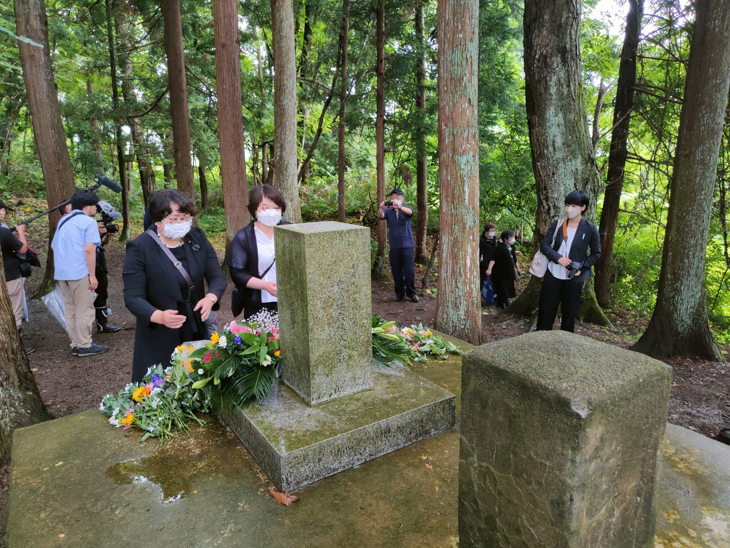 そんな時、秋田県大館市にある「花岡の地 日中不再戦友好碑をまもる会」から、毎年行われている「花岡事件中国殉難烈士慰霊祭」の開催案内を受け取った。戦後いち早く国交回復運動を先導し、今も粘り強く日中友好運動を担い続けている先達は、現在の日中関係をどう見ているだろうか。それが知りたくて、信正寺での慰霊祭に4年ぶりに参加した。参列者50名の小さな集まりだが、僅かながら若者も参加し、メディアの取材も見られた(写真1)。