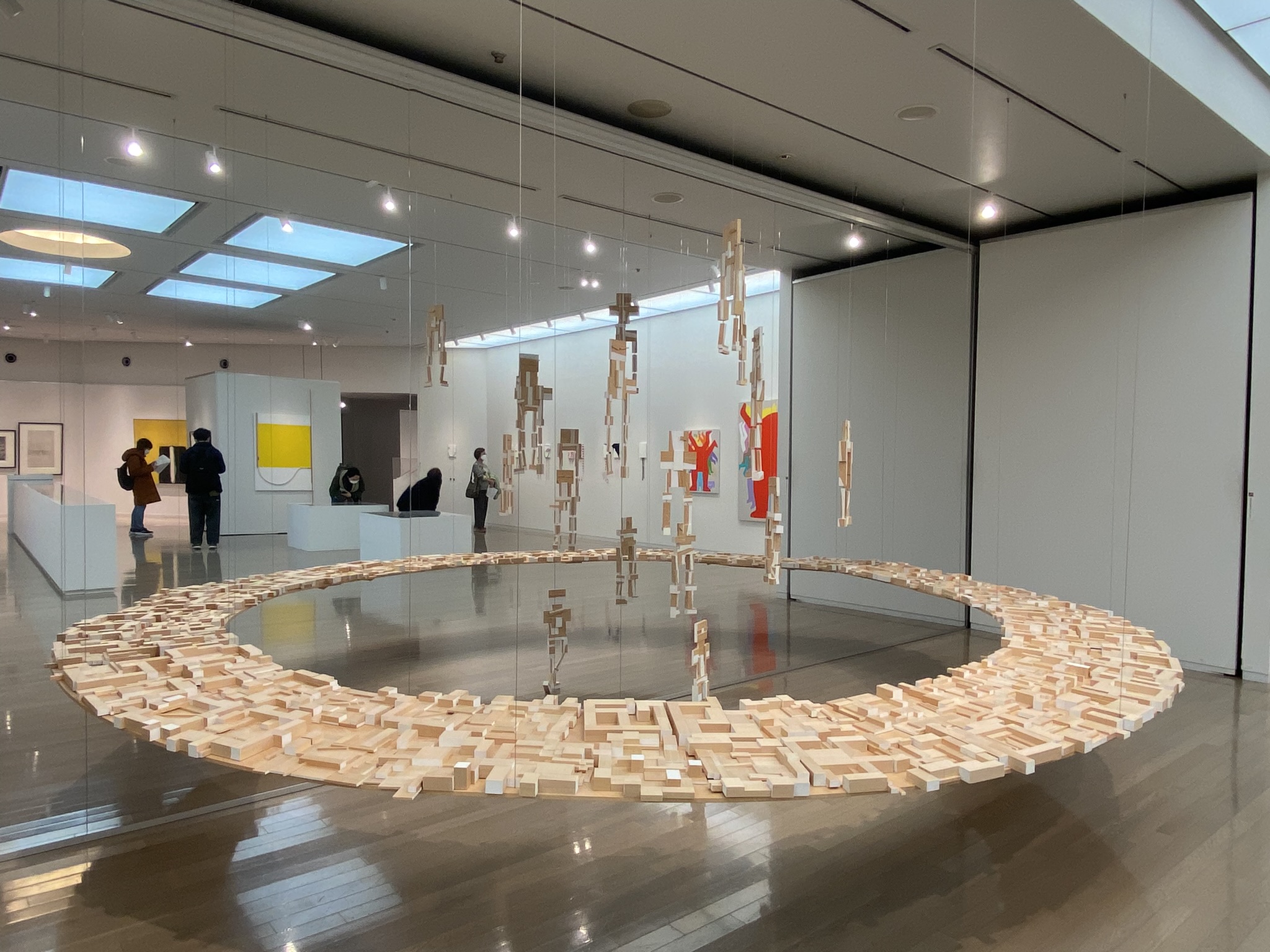 中でも、最新作は「空間」を意識したという。真ん中に大きな円。その上には大小さまざまな木片が並び、まるで街並みが広がるように見える。その中央に同じく木片を組み合わせた「人形(ひとがた)」が吊り下げられていて、一つは床に足が付いている。鏡張りの空間を活用し、「ある」と「ない」ことの関係性や、虚と実の世界を表現した。そして、作家として「自分の内側に向かって」真摯に向かい合いたいと語る。さらに彼女の作品が世界の美術館を廻る予感がしてやまない。
