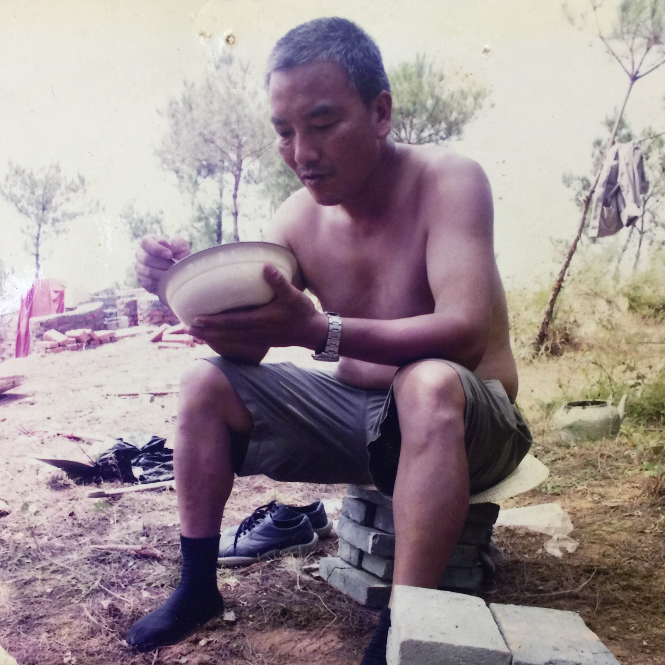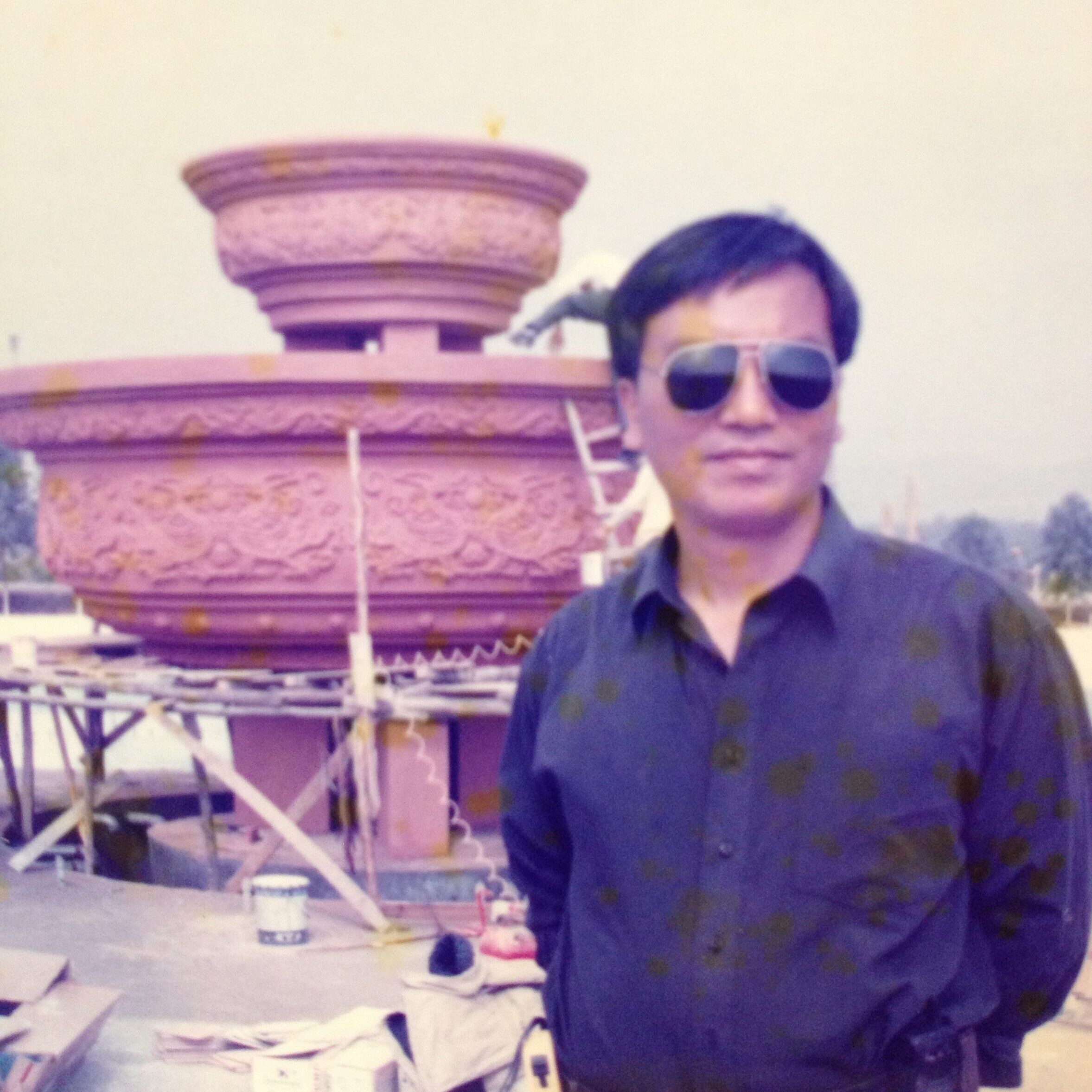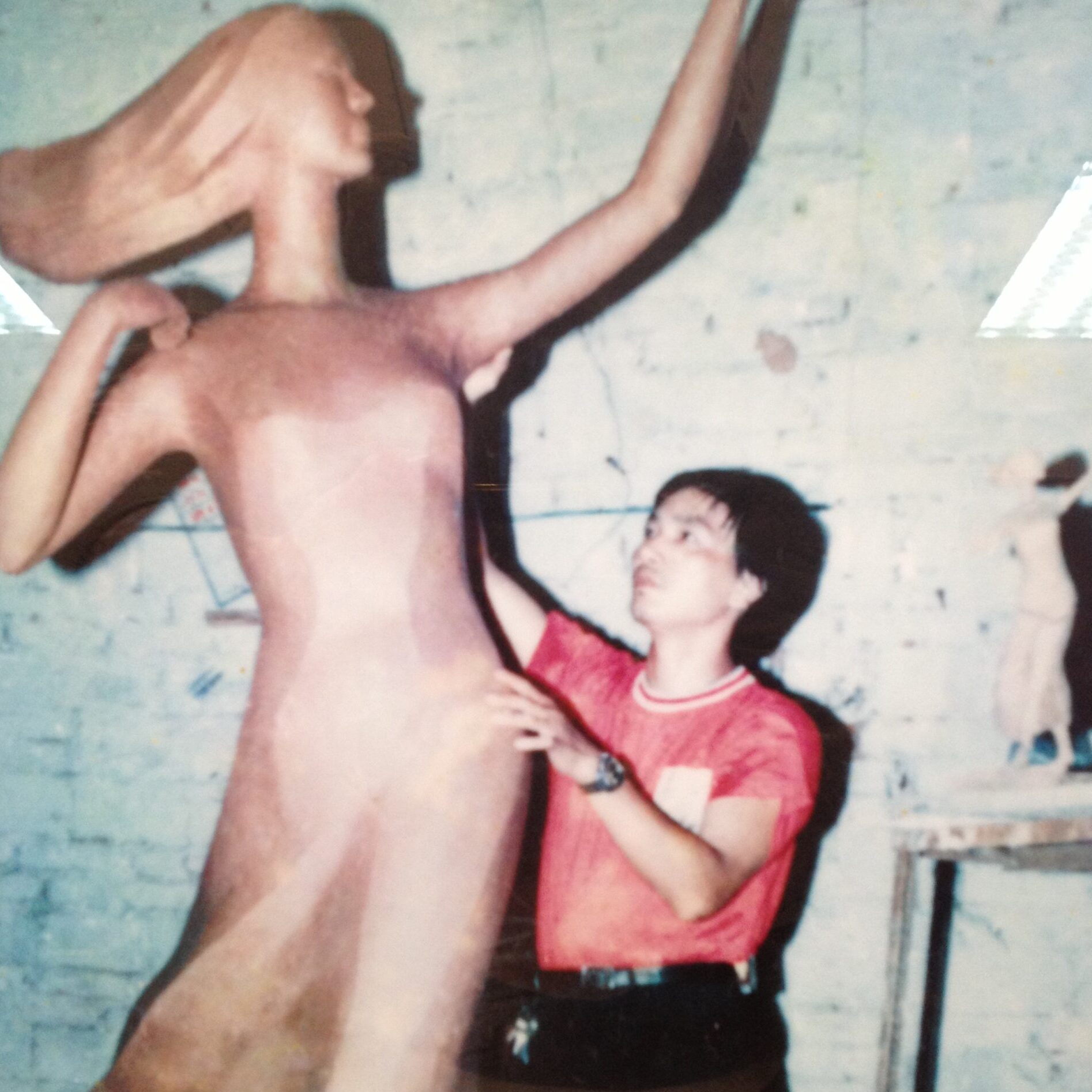 1994年、大型彫刻の制作現場で昼食をとる王氏