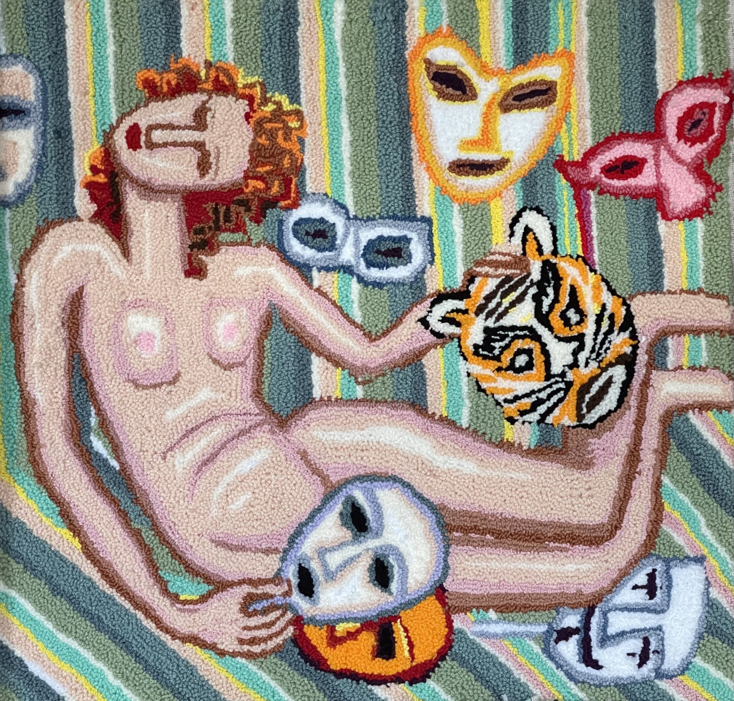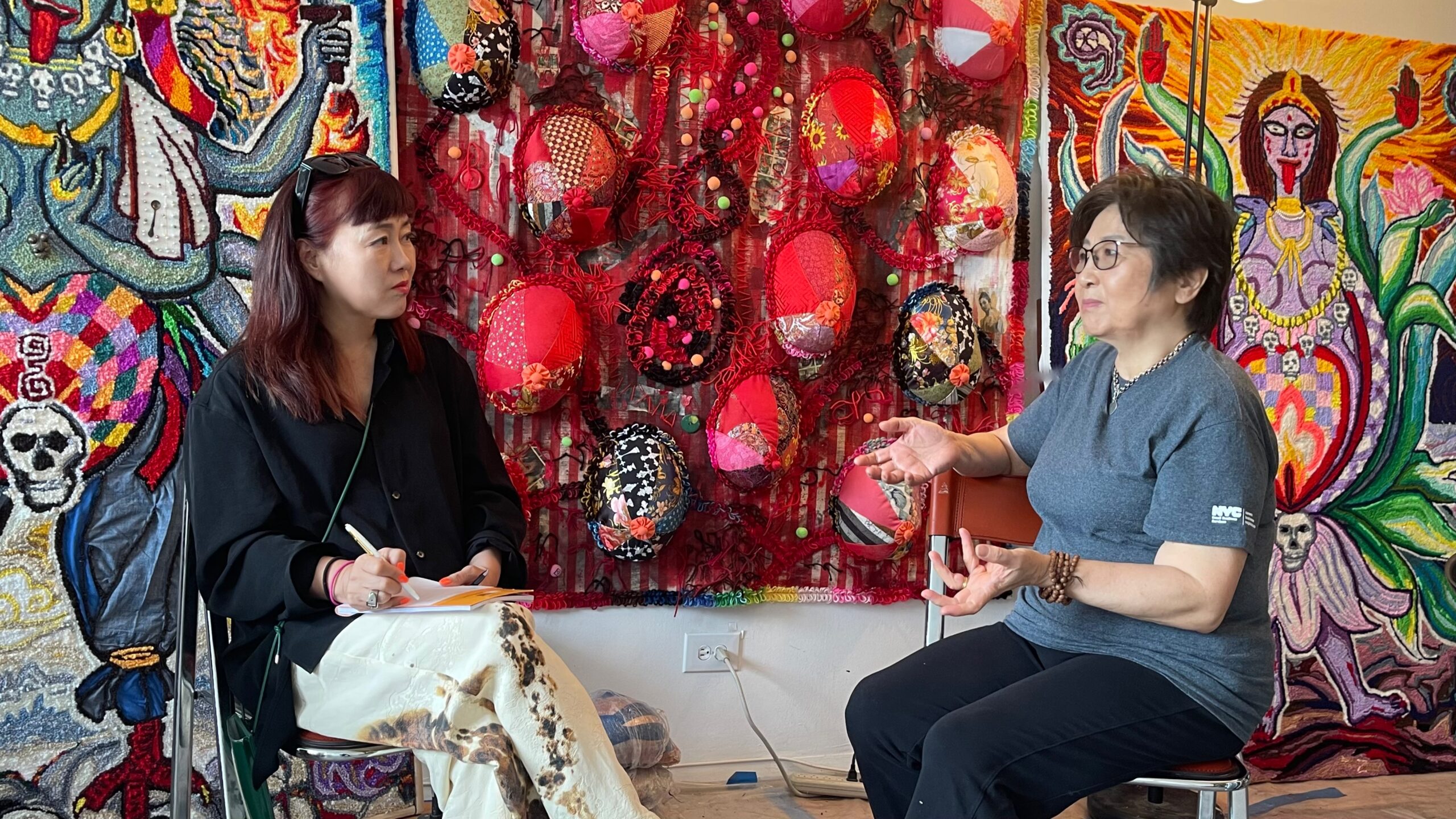 アトリエで見かけた最近の新作シリーズは、壁掛けカーペットのような作品で、キャンバスの裏側からニードルパンチで民間の神様とスカルが描かれている。その横にはスカルの立体作品もあった。
