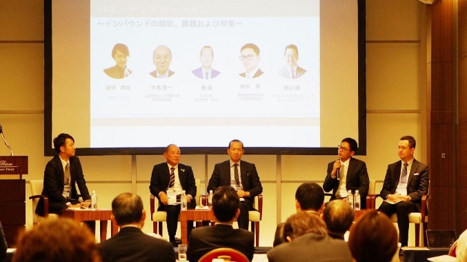 第二会場では、国際観光振興機構の高橋歩代表、大阪観光局営業推進室の中島啓一室長、中央大学経済学部の唐成教授、東通グループの桜井翔代表取締役、株式会社アゴーラホスピタリティーズの田口健副総裁が『インバウンドビジネスのプラットフォーム:インバウンドビジネスの現状と課題と対策』をテーマに討論を行い、インタセクト・コミュニケーションズ株式会社営業統括部マネージャーの道明翔太氏が進行役を務めた。