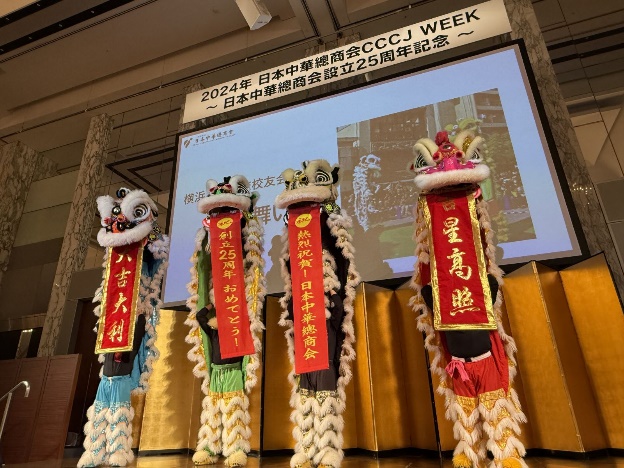 スクリーンには、中日の経済・貿易交流の道を切り拓いてきた日本中華總商会の25年の歩みが映し出され、横浜中華学校校友会国術クラブによる伝統的な獅子舞が会場を魅了した。