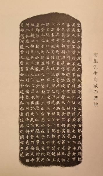 光圀18歳の時に、「中国の歴史の父」と言われた中国前漢の歴史家の司馬遷(紀元前145~87年)の『史記』の「伯夷列伝」に感動し、さらに「菜根譚」を著わした中国の隠遁詩人とうたわれた陶淵明の『五柳先生伝』に深く胸を打たれ、自ら『梅里先生碑文』を生前に建立している。