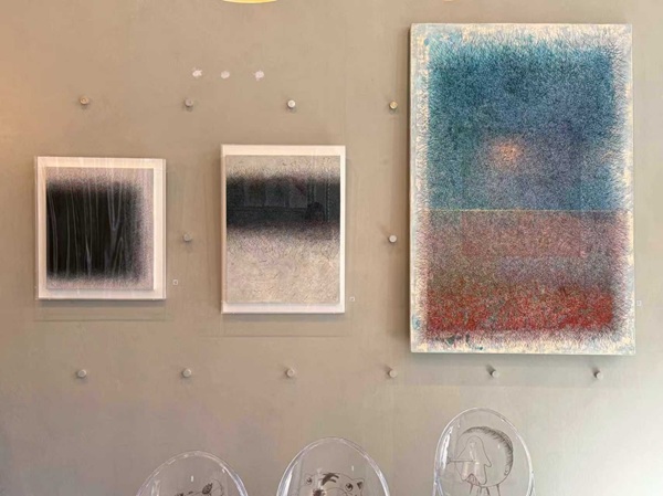 今回展示されているのは、新作を含む十数点。最大の特徴は、無数の線が織りなす画面構造にある。キャンバスに下地の色を施した上に、木炭で何百、何千本もの線を重ね描き、さらに白を塗り重ねることで、立体的な効果が生まれる。蜘蛛の巣のような線の網目に一つひとつ色を置くことで、隣り合う色彩が奥行きを示し、平面でありながら一部が浮かび上がるような独特の視覚体験を観る者に与える。