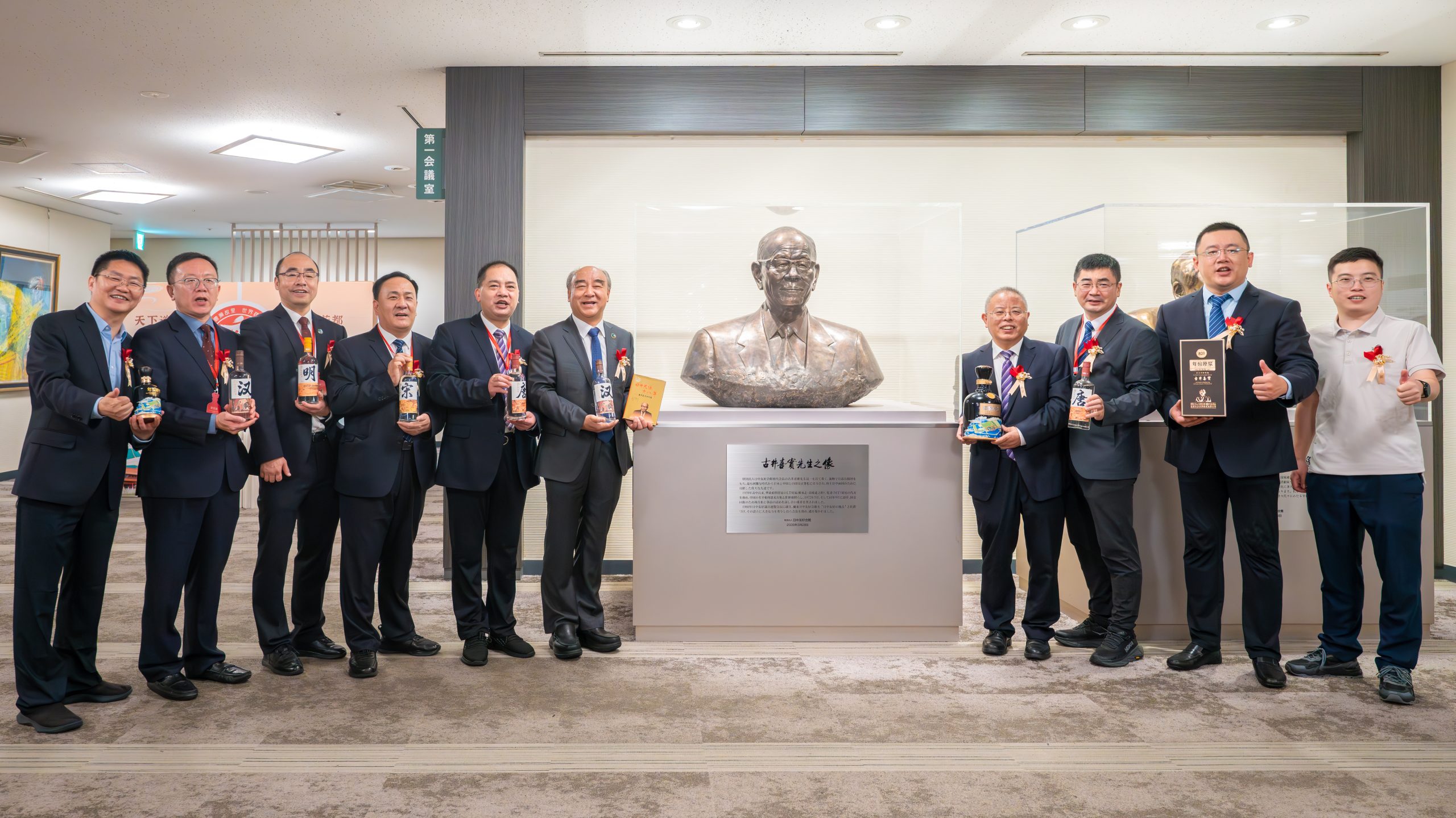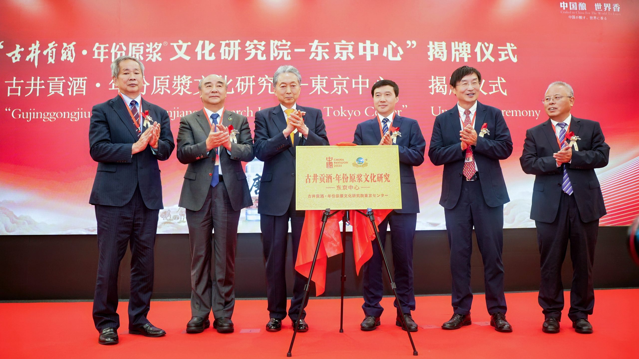鳩山由紀夫元首相も出席し、鐘副市長らと除幕式を行った。梁董事長は日中友好会館の黄星原氏、全日本華僑華人社団聯合会の張書明氏、日本徽商協会の黄平氏、『人民日報海外版』日本月刊の蒋豊編集長に「古井貢酒文化研究員」の任命書を授与し、両国の酒文化交流に新たな拠点が誕生したことを示した。