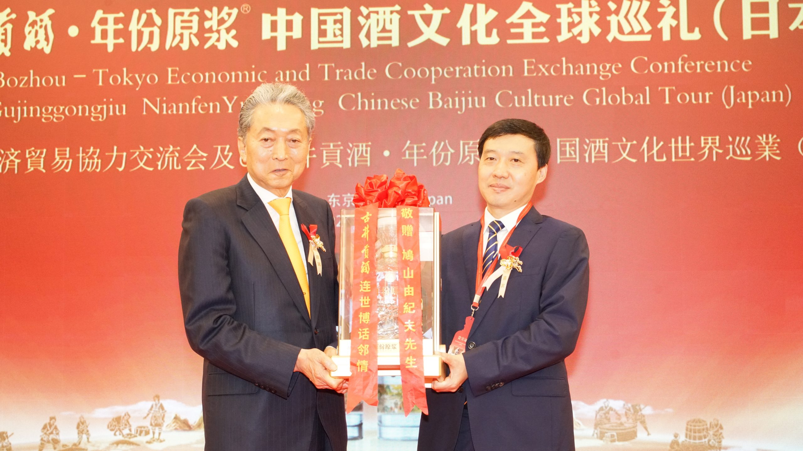 イベントでは、鐘治峰副市長と梁金輝董事長が鳩山由紀夫元首相に記念の「年份原漿」や「漢・唐・宋・明」シリーズを贈り、日中友好への貢献に感謝を表するとともに、酒文化交流の推進と「各表其美・美美与共(おのおのの美を尊び、共に美しくあれ)」という東方の哲学を伝えていきたいと述べた。