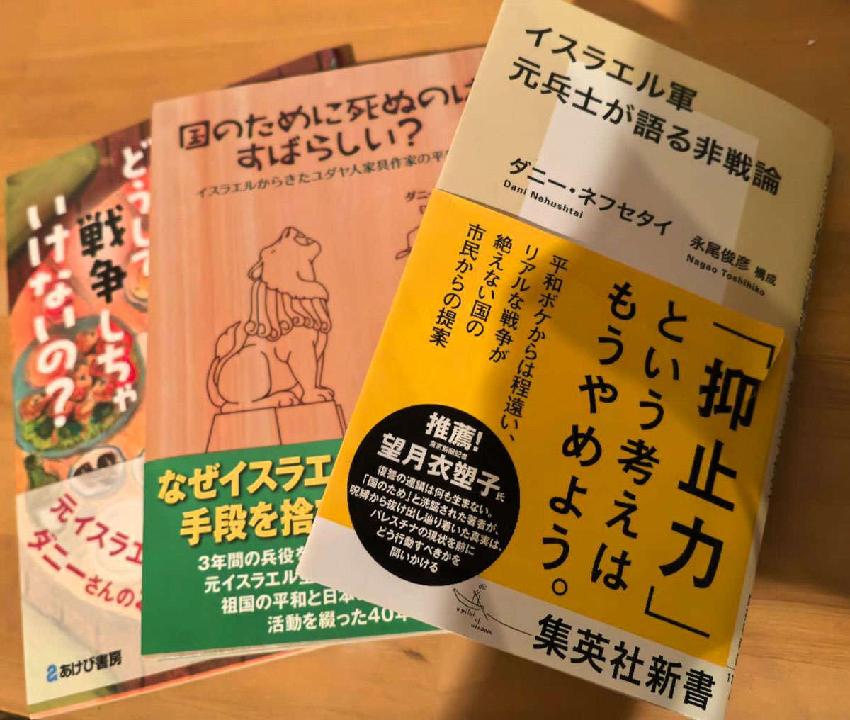 もう一つは、イスラエル人のダニー・ネフセタイの著作に接した時のこと。今年7月、大阪での「七七集会」で彼と同席した。空軍兵士を退役後、日本で40年以上暮らし、今は各地で精力的に平和を語る。彼の3冊の書籍には驚いた(写真1)。イスラエルのパレスチナ侵略と日本の中国侵略にはあまりにも共通項が多い。戦争中の日本だけなく、戦後そして現在の日本とも驚くほど重なりがある。