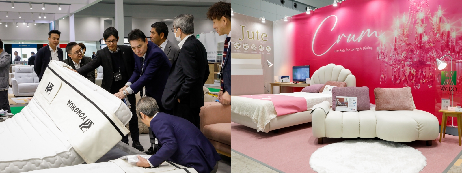 名博(香港)投資有限公司は、17ブースを一体化した総合展示エリアを設け、シングルソファ、収納機能付きソファ、伸縮式ソファなどを一堂に展示。温かさと柔らかさに包まれた空間は来場者を惹きつけ、足を止める人が後を絶たなかった。