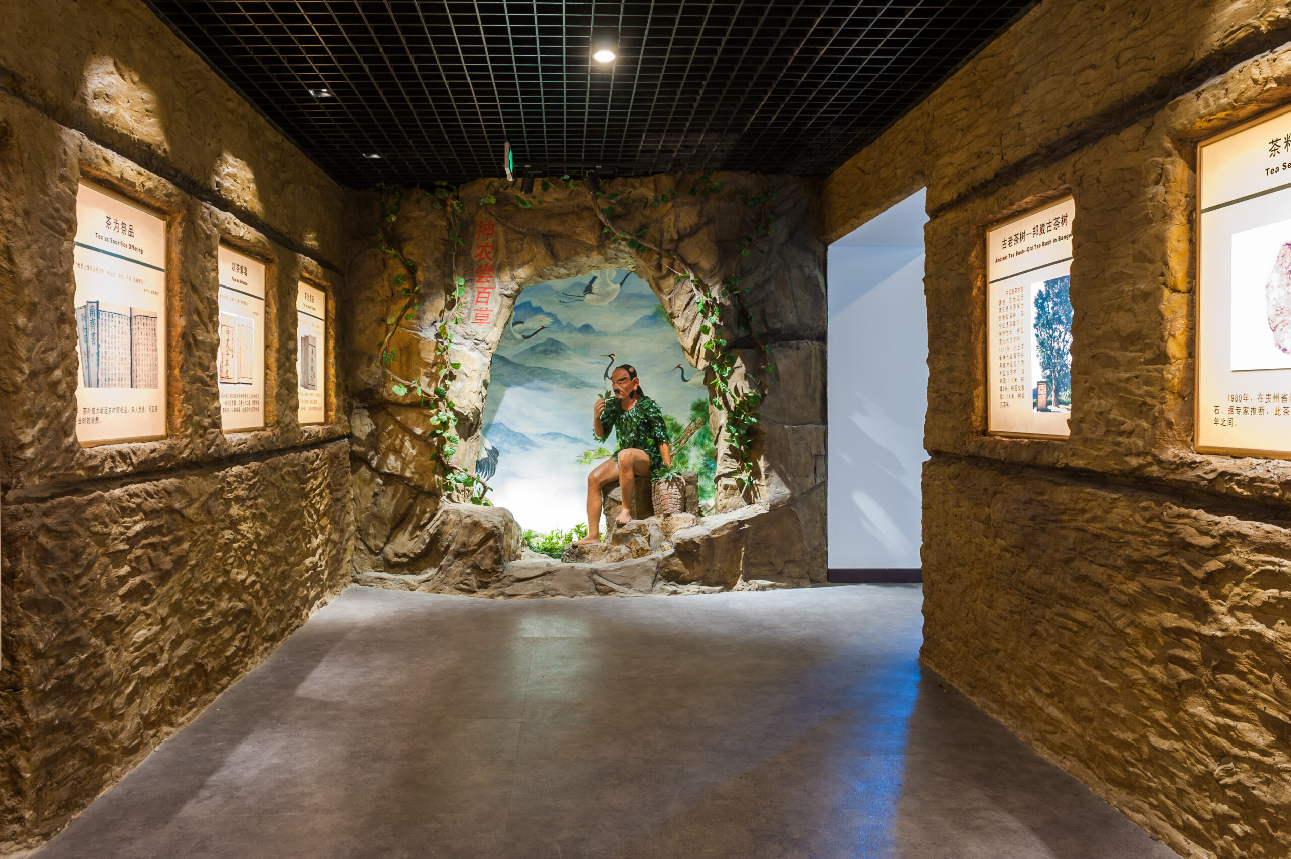 ロビーの巨大なスクリーンには、貴州省晴隆県で発見された165万年前の茶の木の種の化石が映し出され、原始林の朝霧の中で、茶の始祖・神農の手のひらに最初の茶葉がそっと開く様子が描かれている。