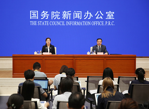 2019年上半期の国民経済の動向を紹介している毛盛勇報道官