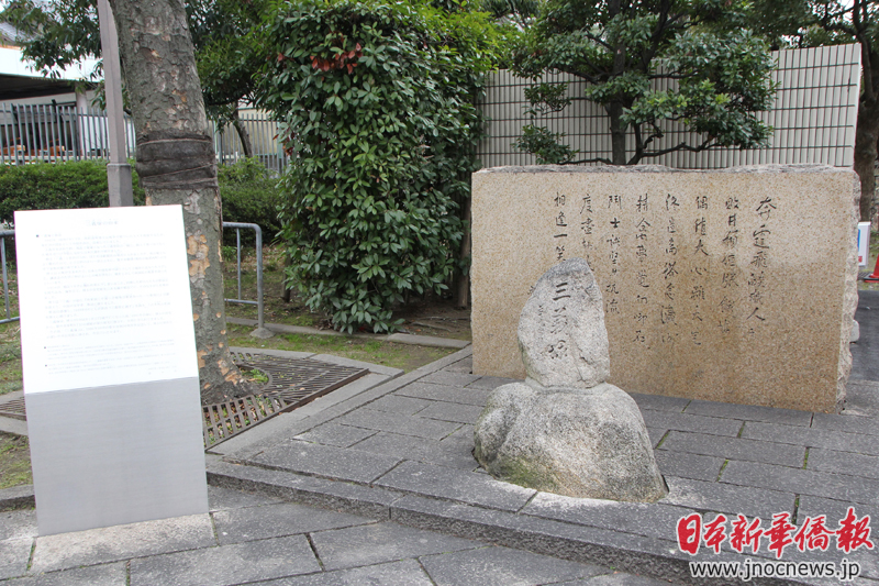 豊中市立中央公民館前の「三義塚」と魯迅の名詩「三義塔に題す」を刻んだ石碑