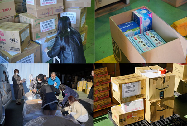 特別報道チームが埼玉県草加市にある楽GOO国際株式会社の倉庫に到着したとき、すでに倉庫には援助物資が満杯に積み上げられていた。大きさもさまざまな段ボール箱には、日本湖北総商会、華人華僑ドラゴンボート協会、日本湖北同郷会、武漢大学日本校友会、日本バイヤー連盟、日本華商経済文化促進会、武漢大道衆彩科技有限公司などの団体、企業、個人の名前が記されていた。