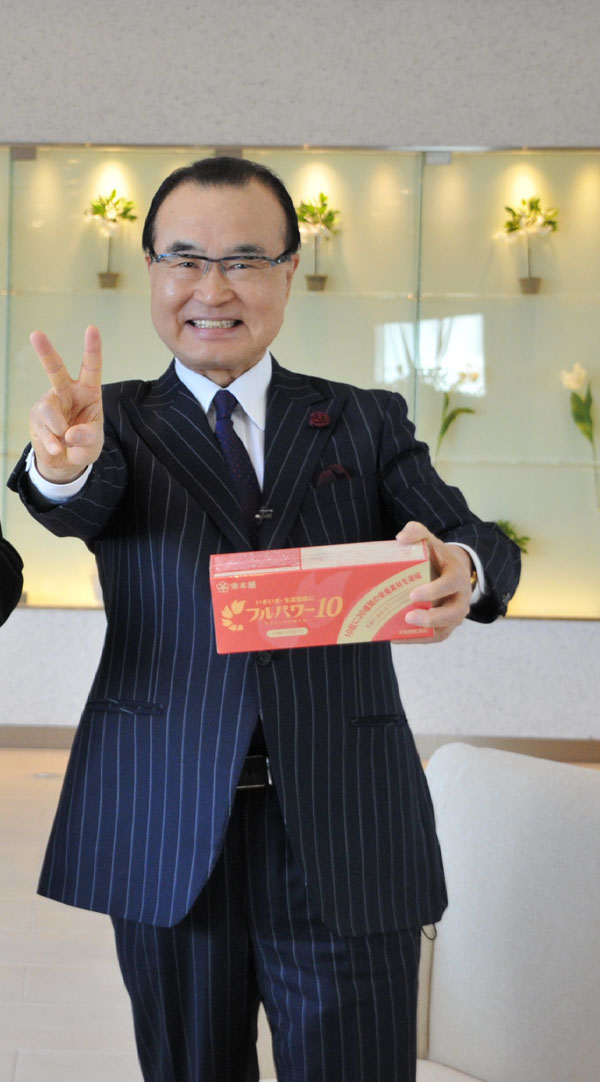 ファッションは健康と並行しなければならないと思います。健康でなければ、ファッションのある生活も楽しめません。人は、健康だからこそ生活の楽しみを本当に味わうことができるのです。流行のスーツ、シャツ、コートを着られれば、仕事もますます頑張れます。これは年齢とは関係ありません。健康でありさえすればみな同じなのです。ですから、流行のスーツを着ている時に気力が充実するように、私は今77歳ですが、もっと健康でいたいと思います。「フルパワー10」を飲んで、ずっと「元気、勇気、AOKI」という気持ちで仕事の第一線に立ちたいと思っています。そして、日本の皆さん、中国の皆さんが77歳になった時に私と同じように全身に活力が満ちているように願っています。ですから、私はAOKIで「フルパワー10」を販売することを決めたのです。