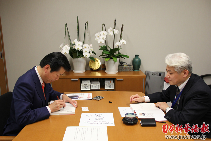 インタビューの終わりに、記者は中国東方出版社から出たばかりの『日本の国会議員、中国を語る』を山口代表に贈った。これには2010年12月に記者が山口代表をインタビューした折の内容も収録されている。代表に「記念に本に揮毫してください」と言うと、笑いながら「それには交換条件があります。頂いた本にもサインしてもらいます」と。そして、山口代表は今回の取材を記念して“至誠一貫”と記した。中日外交において最も重要な心得は“至誠”であることを実感した。