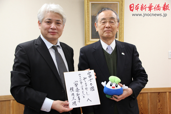 インタビュー終了後、横内知事は富士の国やまなし国文祭の可愛いマスコットと甲州ワイン2本をプレゼントしてくれた。日本には「涙は心の汗、酒は心の血」という言葉がある。横内知事は微笑みながら教えてくれた。「山梨県の甲州ワインは日本で初めて世界で公認され、英国ロンドンで販売されたワインのブランドです。これは山梨県人の心の血です。機会があればぜひ山梨県に来てください。ワインをご馳走しますよ!」。