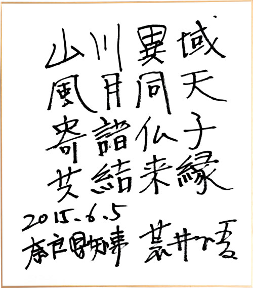 インタビュー終了後に恒例の揮毫をお願いすると、知事は『山川異域、風月同天、寄諸仏子、共結来縁』と書かれた。「これは、『日本と中国の国土は離れているが、大空の風や月に国境はない。同じ仏教を信じる皆さん、一緒に未来のご縁を結びましょう』という意味で、奈良時代の皇族・長屋王が詠んだものであり、中国の僧に送った1000枚の袈裟にこの漢詩が縫い付けられていました。このことを伝え聞いた鑑真和上が有縁の国と思い、日本渡航を決意したゆかりの詩です」と説明してくれた。