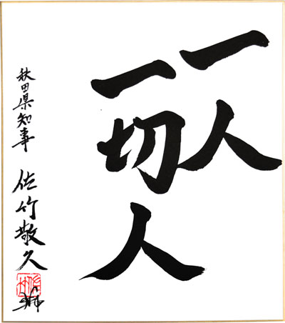 取材後に恒例の揮毫をお願いすると「一人 一切人」と書かれた。これは平安末期の良忍上人の言葉で、「一人の努力は多くの人々に波及し、その結果、多くの人々の努力を促し、今度は一人の人に良い形で返ってくる、そうなることによって、より良い社会が築かれる」という意味だと教えてくれた。知事のお人柄が凝縮された言葉だと感じた。