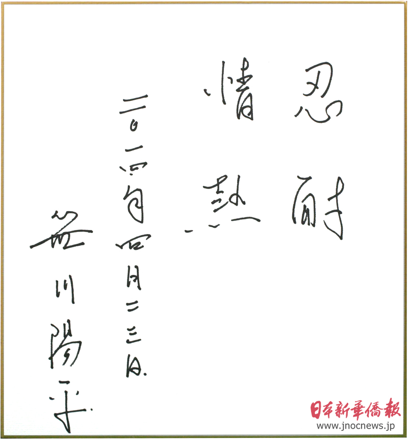 編集後記:取材を終えて、いつものように笹川会長に揮毫をお願いすると、氏は「忍耐」、「情熱」と二つの言葉を記した。そして「日中関係に最も必要なのは忍耐と情熱です」との言葉には真情がこもっていた。