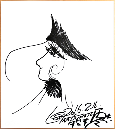 零時社に入ると、まるでプラネタリウムのように、オフィスの壁や天井は星空になっており、松本零士先生の宇宙を愛する心が現れていた。慣例により先生に揮毫をお願いすると、色紙に文字は書かず、流れるようなペンタッチで「銀河鉄道999」の金髪の美女メーテルのイラストを描いてくださった。メーテルのモデルは、先生が偶然に見た一枚の写真に写っていた祖父が若い時に愛した女性だと聞いたことがある。その「伝説」についてはお聞きしなかったが、このメーテルのイラストからは、この女性が先生にとっての最高の美であり、ずっと追いつかない思いをイメージするものだと思われた。