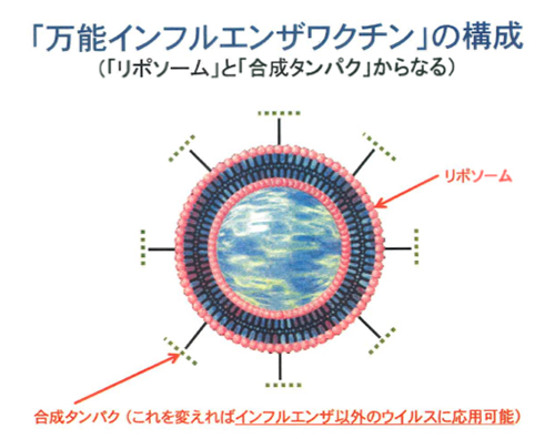 内田 このワクチンはウイルス由来のタンパクをもとに作製された合成タンパクと、それを表面に結合させる担体であるリポソームという、簡素な構成になっていますので、対象疾患はインフルエンザに留まらず、新型コロナウイルス:(COVID-19)の様な新型ウイルスにも迅速に対応することが可能です。