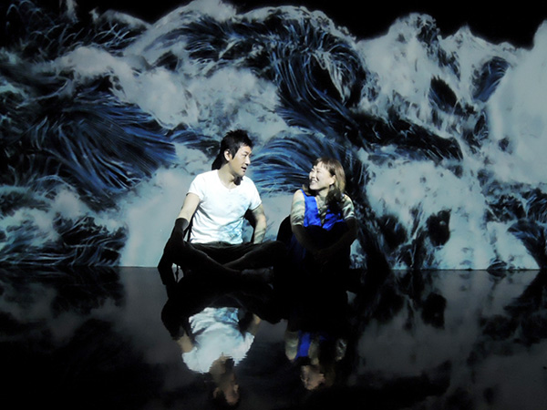 葛飾北斎の「神奈川沖波裏」を連想させる「Black Waves – Continuous」はコンピューター上の空間で三次元の水の動きをシミュレーションし波を構築したという。水の粒子間で生じる相互作用を計算しているため、波のうねりは実にリアルでサイエンスの力を感じさせる作品だ。