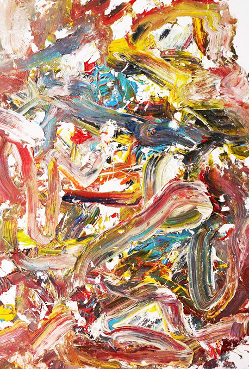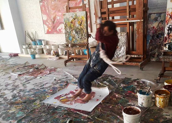 彼は一時ポリテイカル・ポップも経験したが、今は観念抽象絵画に帰着している。氏にとって抽象絵画はセックスに似ていて、相手の反応によって盛り上がったり普通だったり、しらけたりもするという。それよりも抽象絵画の創作過程自体はもっと直感的な感性に頼るべきで、計算し尽くすことは相に合わないと、アトリエの柱に縄をかけて足を使い、全身の感覚を振り絞って絵画を完成する。そのプロセスは、自分史への回顧であり、自己分析の手段であり、いろんな関係性の解析であるわけだ。日本の「具体」注2絵画の白髪一雄のように足を使った技法であり、あえて中国の白髪一雄であると称したい。