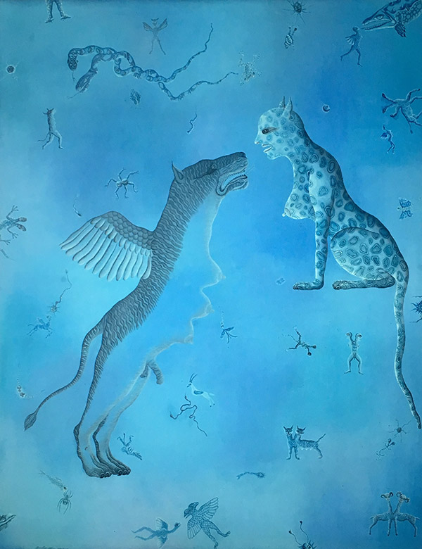 1980年代初期の神秘主義、象徴主義、表現主義、抽象絵画等を貪欲に試みた時期を経て、彼の絵画にはとても美しい、魅惑的な動物と人間が、男と女が、そして何かが一心同体に浮遊している。一見美しい画面は、よく見るととても緊迫した、危ない香りが漂い、「死」を呼び起こす美しさが彼の絵に独特な宇宙観を醸し出している。危ないかもしれないけれど、その耽美な甘い誘惑から目が離せないような感覚に似ている。