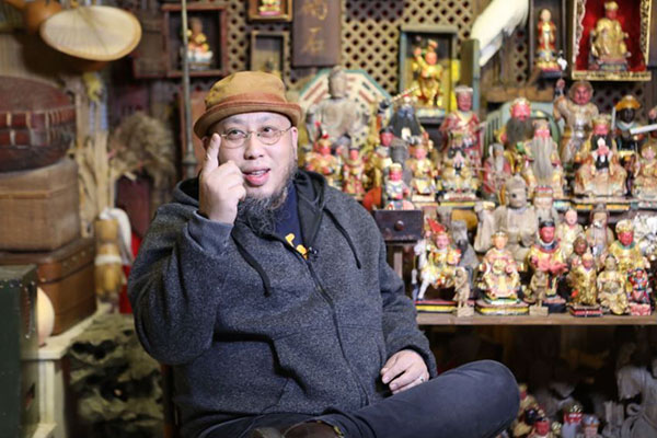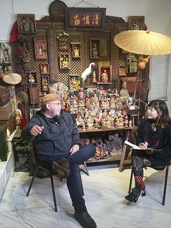取材はその前に椅子を二脚運び進めることになった。北京オペラの監督である両親のもとに生まれた彼は、幼い頃から舞台に立たされ、いろいろやらされたがそれに反発し、華山美術学校という上海で有名な美術専門学校に入り、親に子役にされることから逃げたかったという。その後も、上海大学美術学院に進学し、美術の専門教育を12年間受けた。