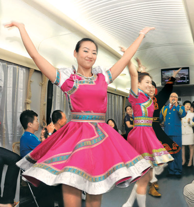 「一路風光、一路歌」とも形容できる専用列車の旅は至れり尽くせりで、同じ列車に集うツアー客たちは楽しく愉快に過ごしながら互いに親睦を深めていく。鉄道部門ではまた、職員で組織した芸術団を乗車させ、旅客に豊富で多彩な文芸プログラムを提供し、色濃い民族風情を顧客に味わってもらっている。中鉄文工団の漫才師の演目は乗客を笑いの渦に巻き込み、車外が夜の帳に包まれても楽しさは尽きることがない。