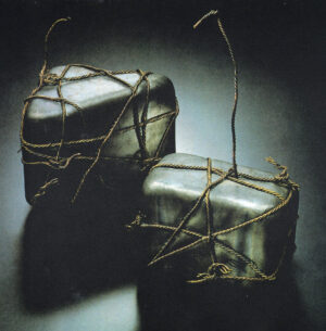 瓦と石彫で知られる速水氏の作品シリーズ、「オバケ」シリーズから、「しばり」シリーズに至るまで、素材の試みとして、地元の肥松や漆との組み合わせにも挑んでいる。速水氏らしいユニークな作品群が精力的に制作され発表されるに従い、異素材たちへの試行錯誤を余儀なくされている。
