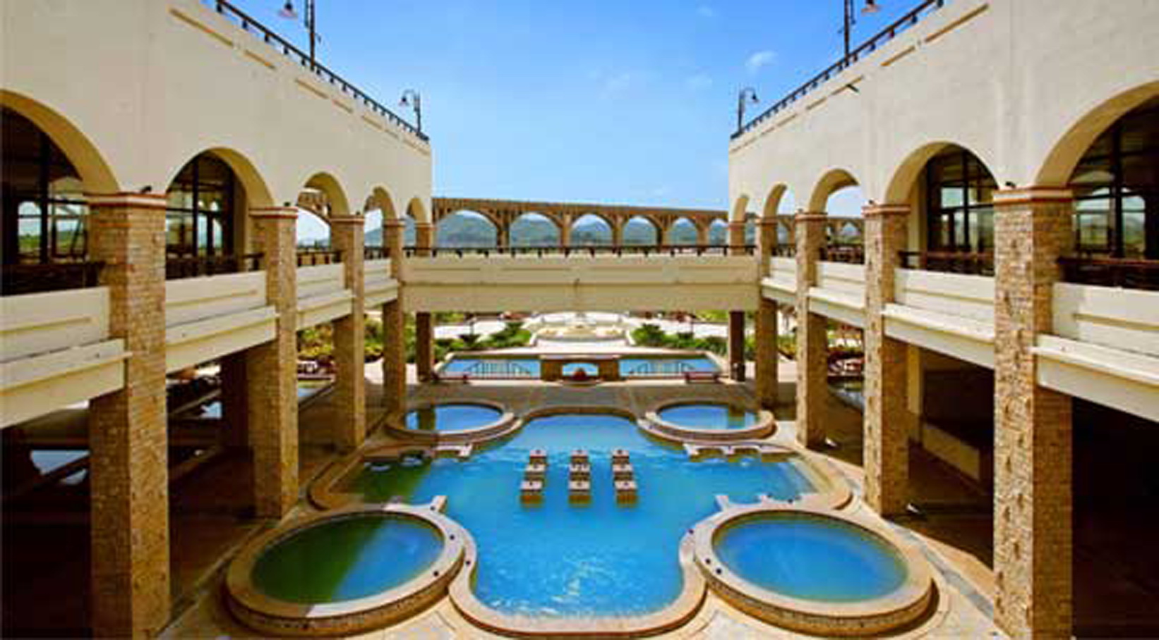 沈海高速道路を下り、常山料金所を出、遠くにぼんやり大水道橋が見えてくると、やがて金湯湾だ。青々とした山河、青い海と白い砂、中国の歴史的建造物である大水道橋。約100km2の海水温泉リゾートは、五つ星ホテルを軸に、放射線状に豪華な宿、?南の伝統的な小庭園、地中海風ヴィラなどが、湾に有効的に配置されている。